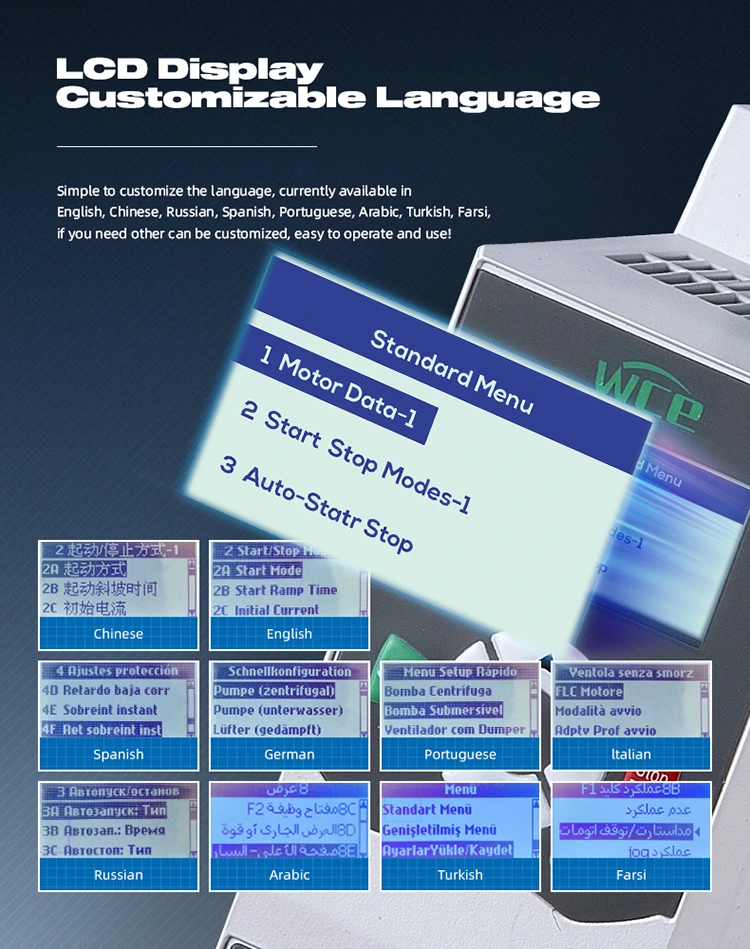ปฏิสัมพันธ์ที่ชาญฉลาดและการดำเนินการที่สะดวก: Soft Starter 360 Series มาพร้อมกับหน้าจอแสดงผลคริสตัลของเหลว LCD การออกแบบอินเทอร์เฟซนั้นง่ายและใช้งานง่ายและประสบการณ์การใช้งานนั้นราบรื่นและสะดวกสบาย ระบบนี้มีฟังก์ชั่นการแสดงผลทั้งภาษาจีนและภาษาอังกฤษและสนับสนุนการปรับแต่งภาษาประจำชาติที่เฉพาะเจาะจงตอบสนองความต้องการของผู้ใช้ในภูมิภาคต่าง ๆ